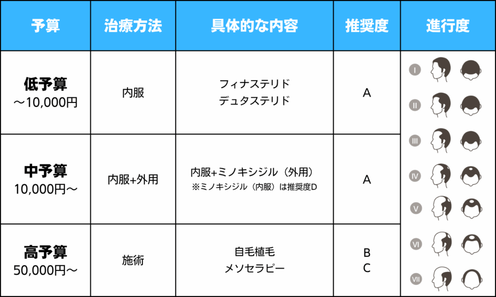 日本皮膚科学会のガイドラインでは、自毛植毛やメソセラピーは、内服治療の効果が得られなかった場合の次の選択肢として医師の判断に基づいて施術することを推奨しています。