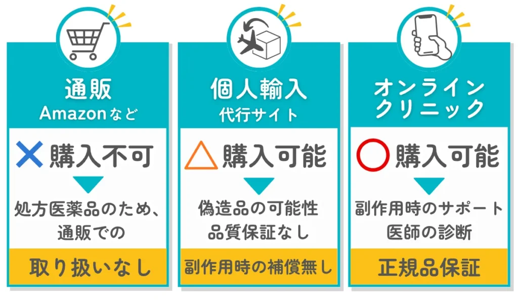 | 手続き | オンラインで注文 (輸入手続きが必要なケースあり) | オンラインで受診・注文 | 医療機関で処方箋をもらう必要あり |